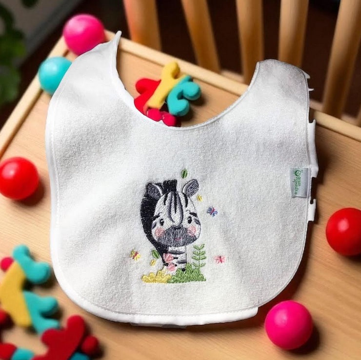 Cute soft terry cloth easy on and off Velcro baby bib with embroidered baby zebra on white bib. Easy to machine or hand wash. Great for to put in diaper baby for on the go feeding.