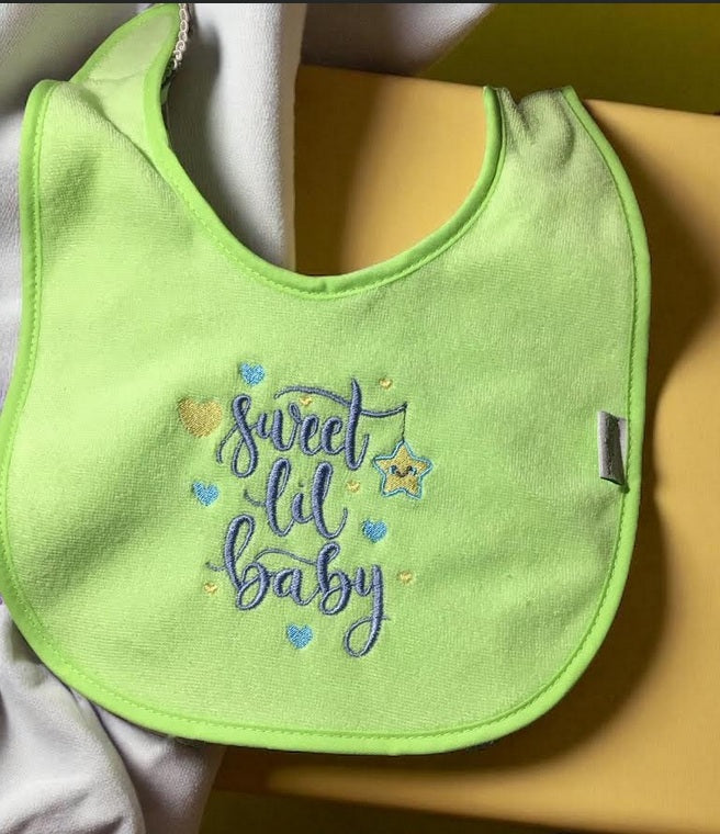 Cute soft terry cloth easy on and off Velcro baby bib with embroidered sweet lil baby on lime green bib. Easy to machine or hand wash. Great for to put in diaper baby for on the go feeding.