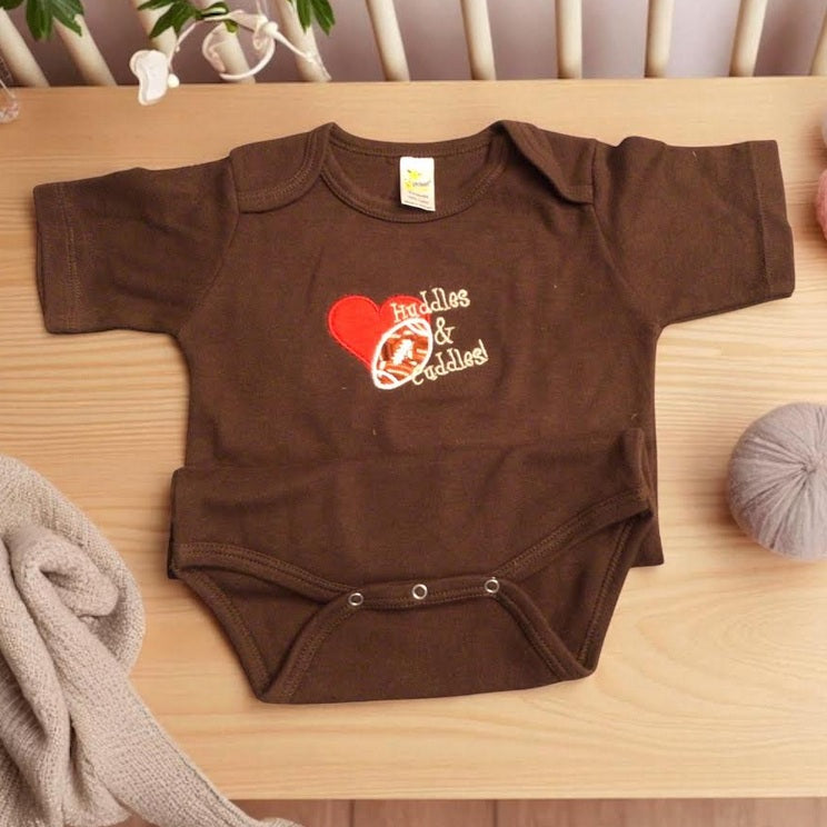 Soft comfortable brown baby onesie with embroidered applique huddles and cuddles football. Size 18-24 months. Wash turned inside gentle cycle and tumble dry.