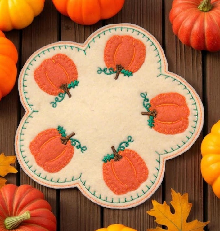 Machine embroidered 6" felt candle mat, perfect for fall decorating with these adorable pumpkins