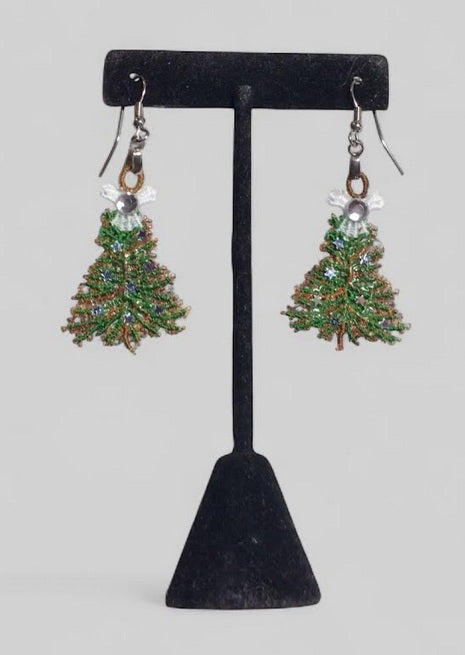Lightweight machine embroidered lace Christmas tree with sequin earrings constructed with poly/rayon thread attached to hypoallergenic stainless steel wires.