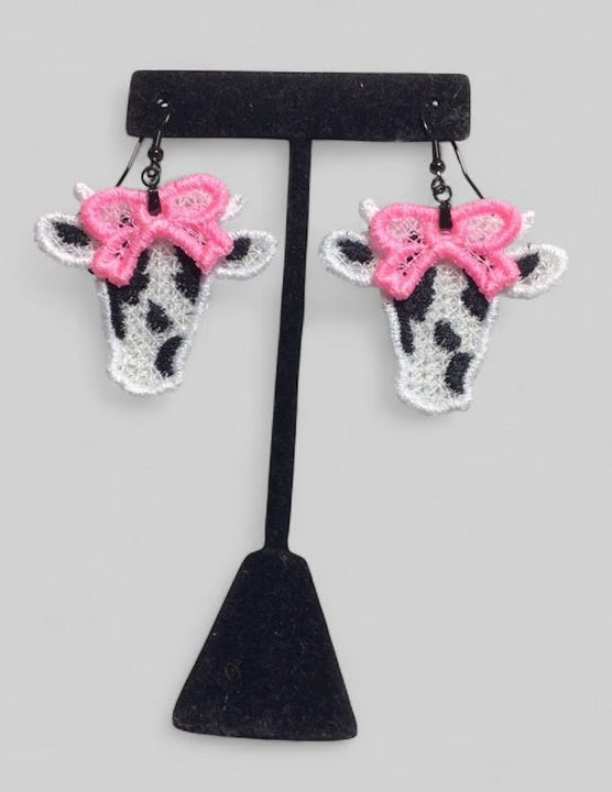 Lightweight machine embroidered lace cow face with bow earrings constructed with poly/rayon thread attached to hypoallergenic stainless steel wires.