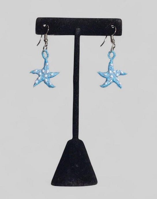 Lightweight machine embroidered lace blue starfish earrings constructed with poly/rayon thread attached to hypoallergenic stainless steel wires.
