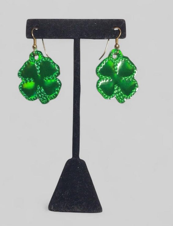 Lightweight machine embroidered vinyl shamrock earrings constructed with embroidery vinyl and poly/rayon thread attached to hypoallergenic stainless steel wires.