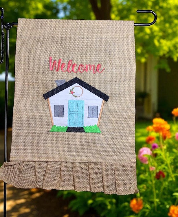 Burlap garden flag with Welcome Applique Home to add to your garden, walk way or front yard. Embroidered design on burlap flag with a clear vinyl backing. Does not come with flag ground stake, which is listed separately.