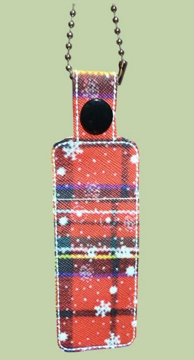 Embroidered vinyl Plain Red plaid with snowflakes Chapstick/Lip Balm Holder on convenient keychain. Easy to wipe clean and great to clip on backpack or purse.