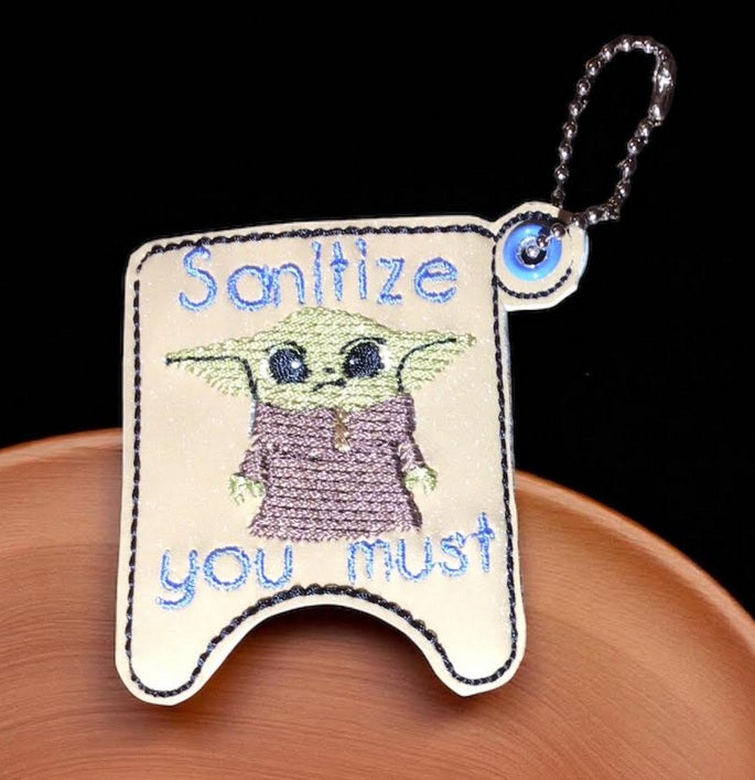 Hand sanitizer holder on key chain convenient to carry with you on purse or backpack. Green baby on tan vinyl, easy to wipe clean.