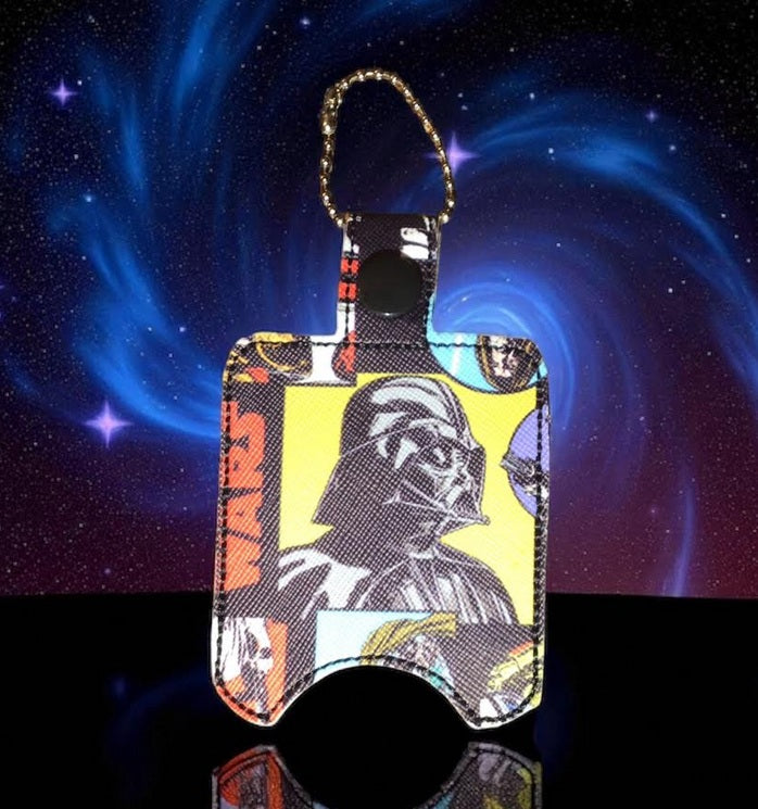 Snap top hand sanitizer holder on key chain convenient to carry with you on purse or backpack. Galactic print vinyl, easy to wipe clean.