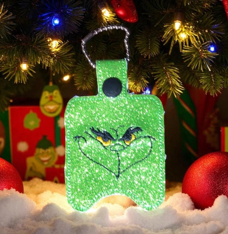 Snap top hand sanitizer holder on key chain convenient to carry with you on purse or backpack. Green face on sparkle green vinyl, easy to wipe clean.