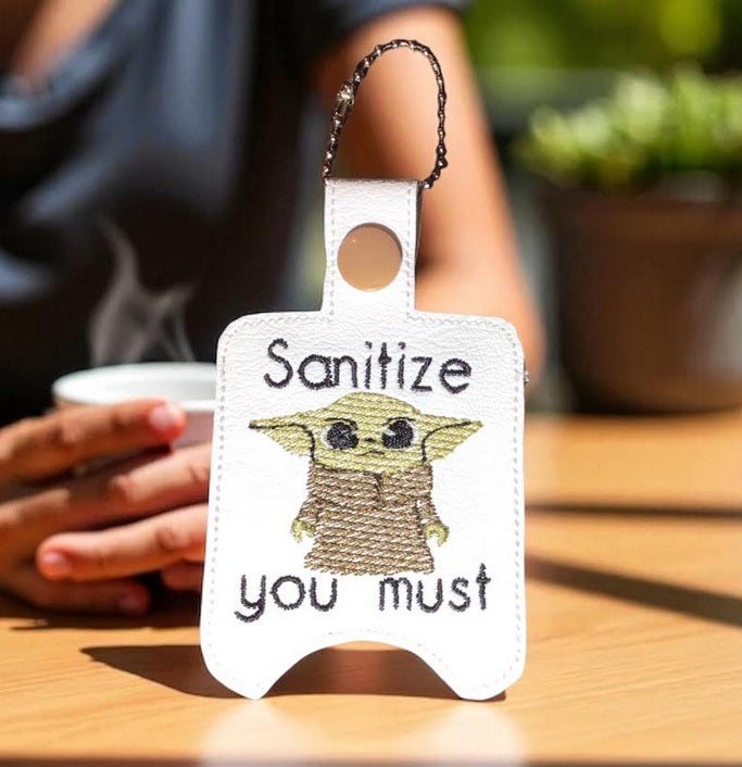 Snap top hand sanitizer holder on key chain convenient to carry with you on purse or backpack. Green baby on white vinyl, easy to wipe clean.