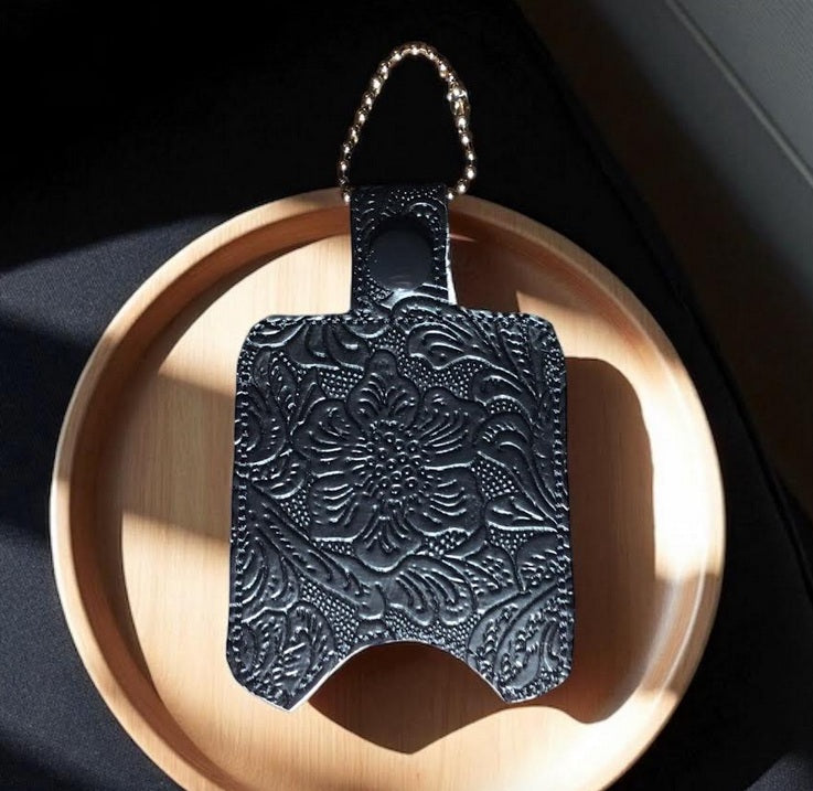 Snap top hand sanitizer holder on key chain convenient to carry with you on purse or backpack. Black stamped vinyl, easy to wipe clean.