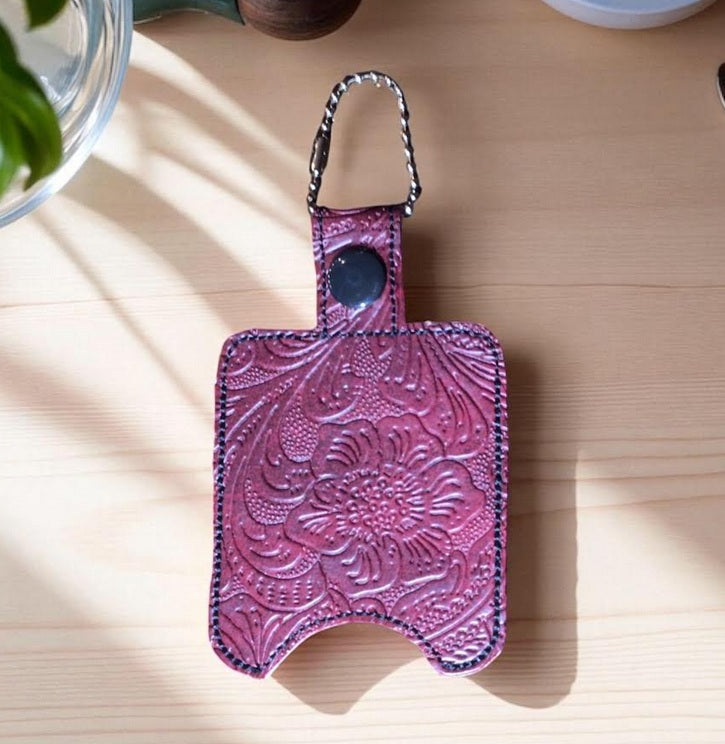 Snap top hand sanitizer holder on key chain convenient to carry with you on purse or backpack. Stamped leather like bown vinyl, easy to wipe clean.