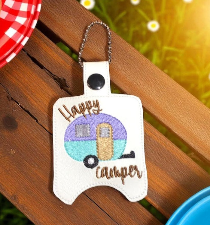 Snap top hand sanitizer holder on key chain convenient to carry with you on purse or backpack. Happy camper on white vinyl, easy to wipe clean.