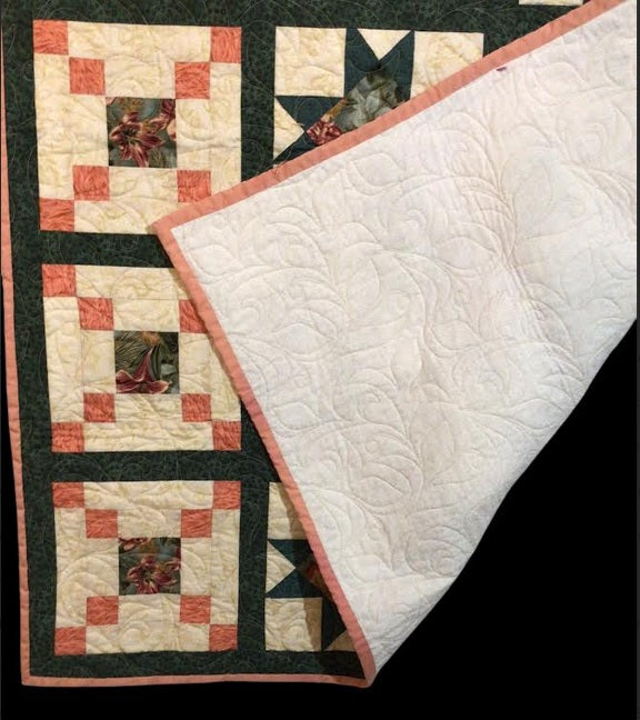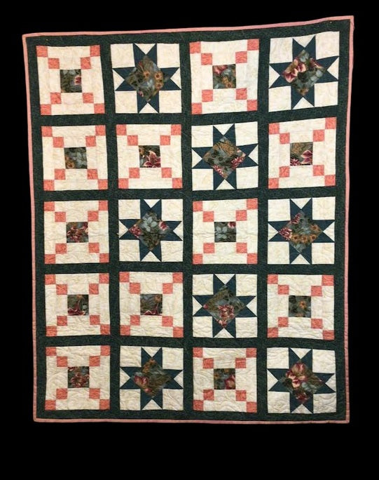 Beautiful cotton 50x42 star block throw quilt. Soft peach, cream and green colors to go with any room, Great for twin bed or have on couch.
