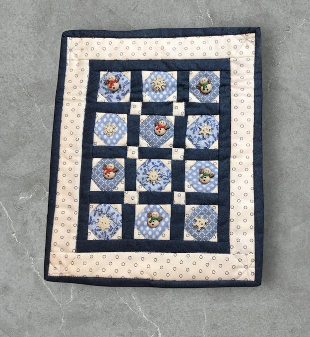 Small 12x9 winter quilted wall hanging with cute little snowmen and snowflake buttons. Great for hanging or gift giving.