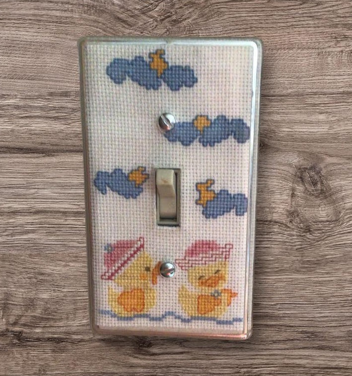 Super cute swithchplate cover for nursery or child room. Single switch cover features little duckies on the water with cute pink hats. Easy to clean acrylic cover, xstitch design on off white 18 count aida cloth and backed with UL-listed foam backing.