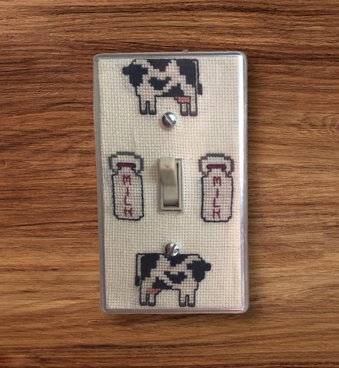 Cute swithchplate cover for room. Single switch cover features little cows with milk containers . Easy to clean acrylic cover, xstitch design on off white 18 count aida cloth and backed with UL-listed foam backing.