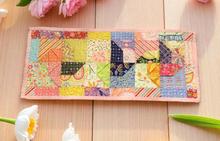 Beautiful and colorful 29x13 cotton quilted pinwheel table runner, perfect for any spring decorating or gift giving.